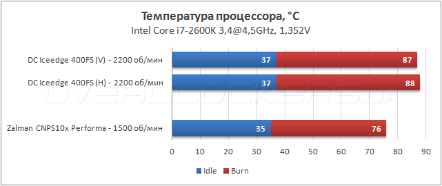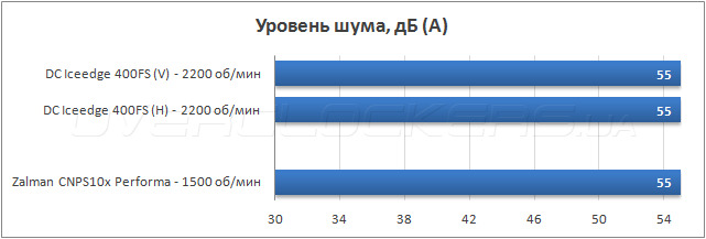 Deepcool Iceedge 400FS смог справиться с охлаждением стендового процессора лишь на максимальной скорости вращения своей крыльчатки — 2200 об/мин, уровень шума при этом составил 55 дБ (А). Поэтому я подобрал скорость Zalman CNPS10X Performa под указанный выше уровень шума и получил 1500 об/мин на выходе. В таких условиях и было проведено сравнение. Кроме того, были измерены показатели температуры при повороте Iceedge 400FS как в вертикальное (V), так и в горизонтальное положение (H). Так я хотел узнать, насколько критична для температурных показателей смена ориентации кулера.
