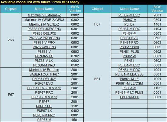 Перечень решений, совместимых с будущими процессорами Ivy Bridge чуть шире и включает 43 наименования, то есть все серийно выпускаемые Asus материнские платы LGA1155 на чипсетах Intel Z68, P67, H67 и H61.