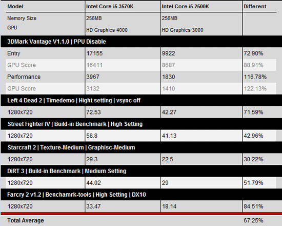 По итогам серии тестов Intel HD Graphics 4000 существенно обошла оппонента (67%) и продемонстрировала неплохой средний фреймрейт в относительно современных играх. Правда, разрешение экрана составляло всего лишь 1280x720 точек.