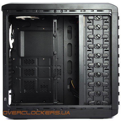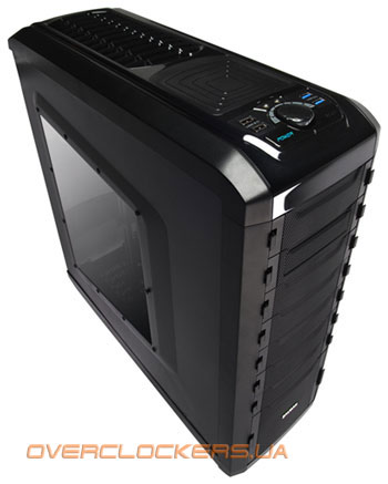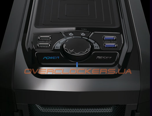 На панели ввода-вывода в передней части корпуса находятся два порта USB 2.0, такое же количество USB 3.0, разъемы для наушников и микрофона, кнопки Power и Reset, а также 6-канальный контроллер оборотов вентиляторов.