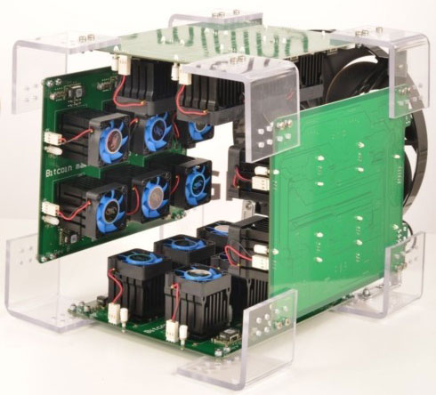 В сентябре производитель таких систем KnCMiner выпустит для заинтересованной публики устройства Jupiter и Saturn стоимостью $7000 и $3700 соответственно. Они имеют высочайший показатель производительности на один доллар — до 50 Mhash/$, а также солидное энергопотребление — 1000 и 500 Вт. В структуре систем будет использоваться множество микрочипов (ASIC), изготовленных по 28-нм техпроцессу. Например, у изображенного на фото прототипа около 20 чипов, причем каждый из них оборудуется собственным кулером. Производительность KnCMiner Jupiter составляет 350000 Mhash/с, KnCMiner Saturn — 175000 Mhash/с.
