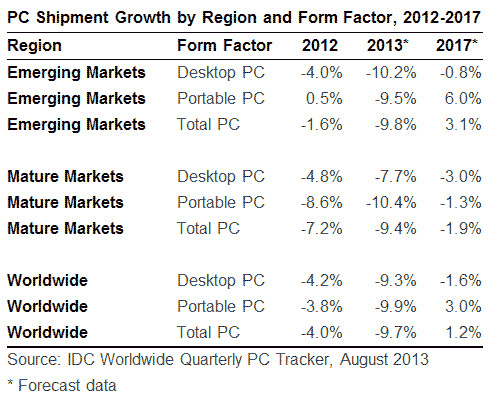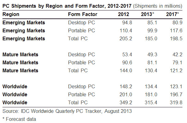 В приведенных таблицах указаны данные для развивающихся (emerging) и сложившихся (mature) рынков, а также цифры мировых поставок компьютеров в сборе. В текущем году продажи ПК снизятся на 9,7%, причем рынок лэптопов сократится на 9,9%, а настольных систем — на 9,3%. За пять лет показатели мобильного сегмента восстановятся: в IDC делают ставку на развивающиеся страны, где поставки вырастут с 99,9 млн ед. по итогам 2013 г. до 117,6 млн ед. Пока неясно, что так привлечет небогатых покупателей — ультрабуки, гибриды, субноутбуки? Вопрос остается открытым.