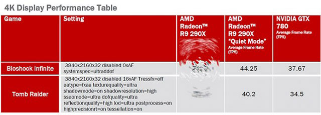 Соперником Hawaii стала карта GeForce GTX 780 из «зеленого» лагеря. Тесты проводились в двух играх — Tomb Raider и Bioshock Infinite. Участие этих приложений в программе AMD Gaming Evolved, а также высокое разрешение экрана (3840 x 2160 точек), наводят на мысль о том, что для Radeon R9 290X были созданы оптимальные условия. Своеобразная «игра на своем поле» обеспечила адаптеру AMD солидный перевес: