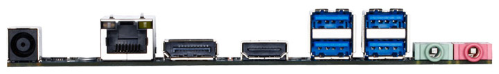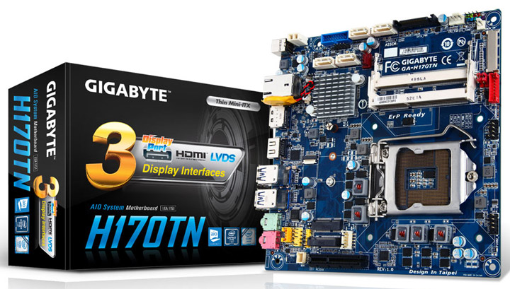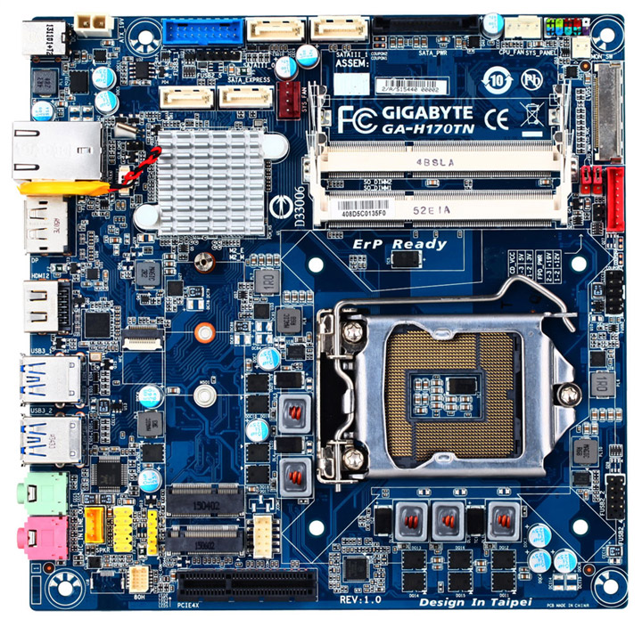 Запитанный от пяти фаз сокет LGA1151 допускает установку процессоров Skylake-S (Core, Pentium, Celeron) с тепловым пакетом до 65 Вт. На задней панели Gigabyte GA-H170TN находятся порты RJ-45, DisplayPort, HDMI, USB 3.0 (4), гнезда для адаптера питания, наушников и микрофона.