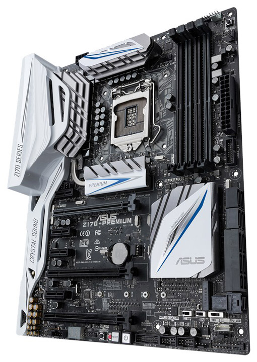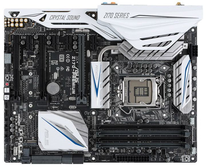 В продукте Asus Z170-Premium сокет запитан от 20 фаз, слоты для оперативной памяти могут работать с модулями ОЗУ DDR4-2133/.../4000 общим объемом 64 ГБ. Графические связки будут функционировать на скорости x8/x8 или x8/x8/x4 (только CrossFireX). Кроме вышеупомянутого U.2, для подключения накопителей предусмотрены интерфейсы M.2 (32 Гбит/с), SATA Express (2 ед.) и SATA 6 Гбит/с (4 ед.).