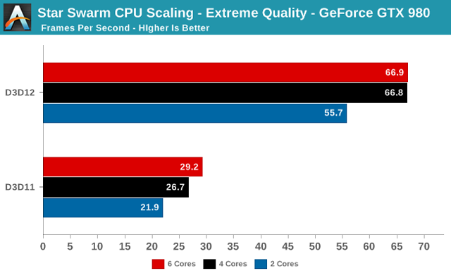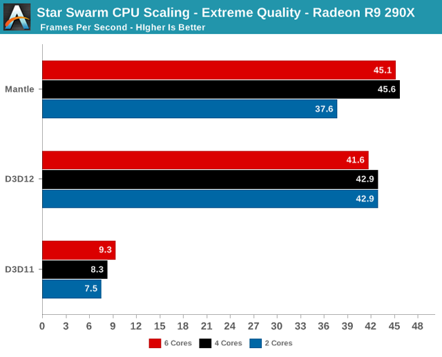 Требования к производительности центрального процессора у DirectX 12 намного ниже, чем у предыдущей версии. Так, для полного раскрытия потенциала Radeon R9 290X в Star Swarm оказалось достаточно двух (!) ядер процессора Intel Core i7-4960X (@3,8 ГГц). Жаль, что у AnandTech не нашлось времени, чтобы протестировать систему с CPU от AMD.