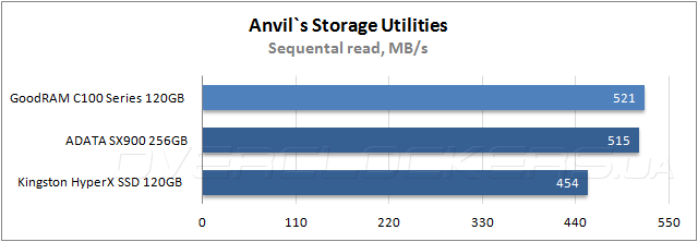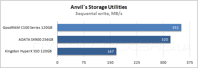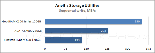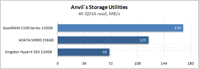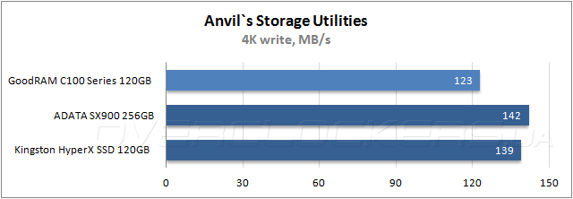 В операциях линейного чтения GoodRAM C100 Series 120GB выигрывает не только у прямого конкурента — накопителя Kingston, но и у более производительного ADATA. К слову, лишь новичок достигает заявленных производителем показателей быстродействия.