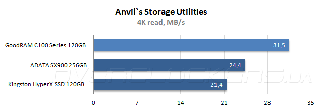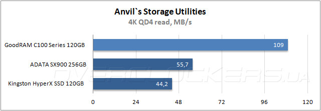 При работе с блоками 4К герой сегодняшнего обзора снова недосягаем для устройств на базе контроллера SF-2281. Нельзя не отметить великолепную поддержку NCQ, с ростом глубины очереди запросов преимущество GoodRAM C100 над соперниками увеличивается в разы.