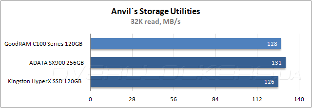 С увеличением объема блоков до 32К результаты всех трех конкурсантов сравниваются, но в операциях с файлами размером 128К на первое место выходят накопители «SandForce Driven», особенно заметно превосходство ADATA SX900 256GB.