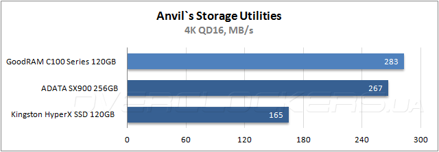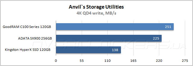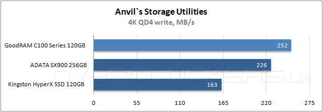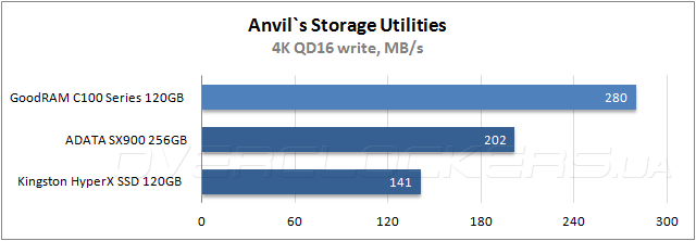 Во время работы с блоками 4К падение быстродействия для ADATA и Kingston уже не наблюдается, поэтому, твердотельный диск GoodRAM проигрывает соперникам. После формирования очереди команд на запись новичок возвращает лидерство, особенно заметное в тесте с очередью из 16 запросов, где оба накопителя на базе SandForce снижают быстродействие до 25%.