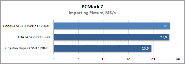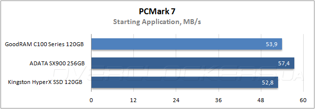 Общий балл в подтесте Storage из состава бенчмарка Futuremark PCMark 7 позволяет судить об уровне продуктивности накопителей при выполнении типичных прикладных задач. Результаты героя сегодняшнего находится ровно посередине между двумя другими соперниками.