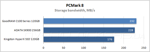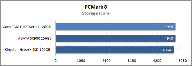 В завершении мы оценили быстродействие SSD в новейшем Futuremark PCMark 8, где твердотельный накопитель GoodRAM прямо таки громит продукт Kingston и показывает результаты на уровне более дорогого ADATA SX900 256GB.