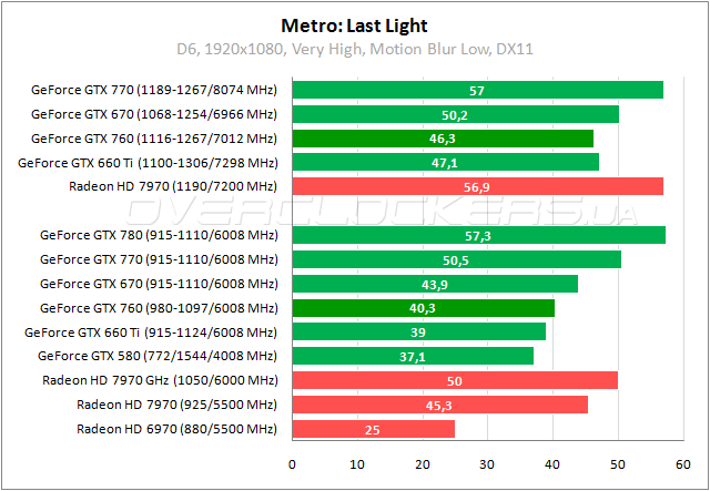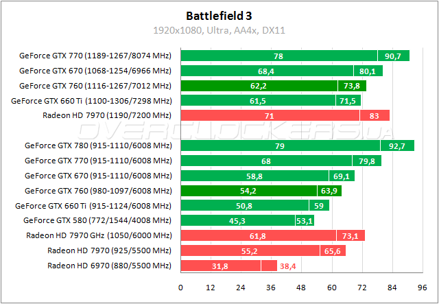 GeForce GTX 760 обходит GeForce GTX 660 Ti на 7–8% и GeForce GTX 580 на 20% в Battlefield 3. Выигрыш относительно Radeon HD 6970 почти 70%. Начальный уровень производительности очень близок к простой версии Radeon HD 7970, хотя за конкурентом AMD все же остается небольшое преимущество. Разгон позволяет немного обойти версию GHz Edition. При сравнении разогнанных карт преимущество относительно GeForce GTX 660 Ti снижается до 1–3%.