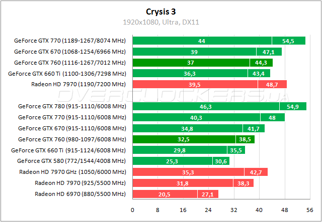 GeForce GTX 760 в Crysis 3 изначально демонстрирует минимальное преимущество над Radeon HD 7970. При разгоне соперник выходит вперед благодаря лучшему частотному потенциалу. Разница с GeForce GTX 660 Ti на уровне 9% в номинале и 2% при разгоне. Отставание старого GeForce GTX 580 составляет 26–28%. Radeon HD 6970 слабее на 42–59%.