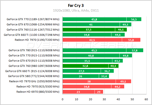 В Far Cry 3 GeForce GTX 760 немного сдает позиции относительно Radeon HD 7970, уступая сопернику 6–10%. Заметный выигрыш относительно GeForce GTX 660 Ti — 20% по минимальному fps и 10% по среднеигровому параметру. Отрыв от GeForce GTX 580 достигает 20–24%.