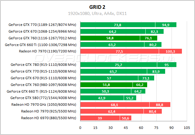 Минимальное преимущество GeForce GTX 760 над GeForce GTX 660 Ti в GRID 2, в разгоне предшественник даже лучше. Значительное отставание от Radeon HD 7970 в 21% разгоном GeForce GTX 760 не компенсируется. Зато форсированному GeForce GTX 660 Ti удается сравняться с этим соперником.