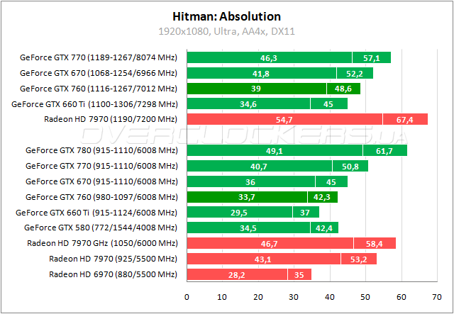 Последняя часть Hitman предпочитает графические решения AMD. Тут отрыв Radeon HD 7970 очень веский, никаким разгоном GeForce это не компенсировать. Ранее мы не раз отмечали сильную зависимость производительность в игре от пропускной способности памяти, а результаты GeForce GTX 760 и GeForce GTX 660 Ti это лишь подтверждают — предшественник слабее на 12–13% в номинале и на 8–13% при разгоне.