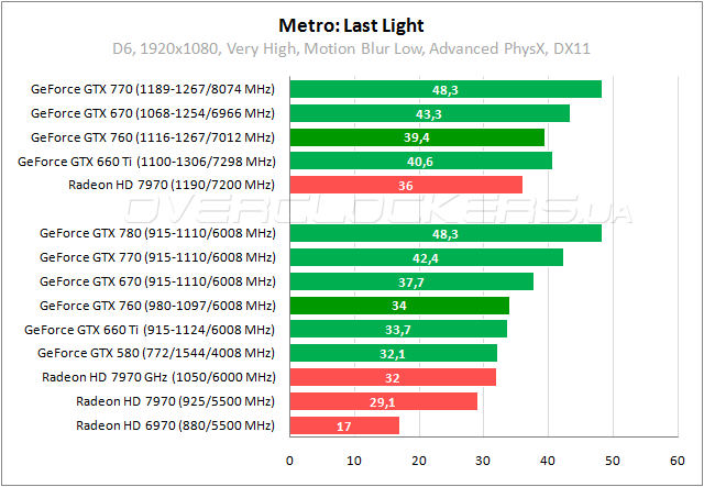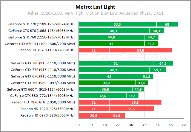 GeForce GTX 760 обходит старшую версию Radeon HD 7970 по среднему fps, по минимальному результат соответствует простой версии Radeon HD 7970. GeForce GTX 660 Ti слабее на 8–12% в номинале и на 4–10% при разгоне. GeForce GTX 580 уступает 3–8%, и это, наверное, минимальная разница между ним и новичком во всех приложениях.