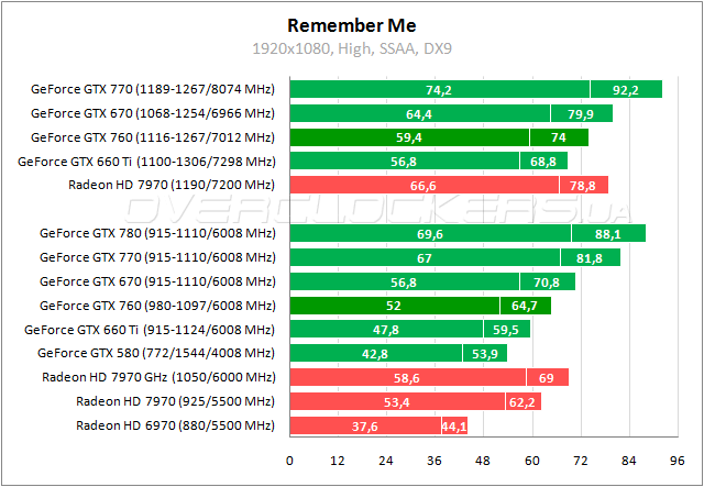 В игре Remember Me можно говорить о паритете между GeForce GTX 760 и Radeon HD 7970 в номинале. Преимущество относительно GeForce GTX 660 Ti небольшое, но оно сохраняется и при разгоне. GeForce GTX 580 слабее на 20–21%.