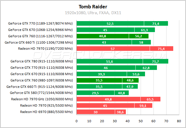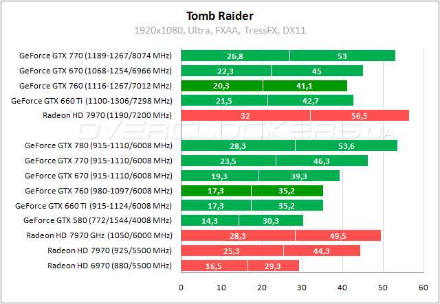 В Tomb Raider видеоадаптеры GeForce GTX 760 и GeForce GTX 660 Ti при заводских частотах идут наравне, в разгоне старичок немного быстрее. Разница с GeForce GTX 670 на уровне 10–11%, отставание от Radeon HD 7970 достигает 22–27%.