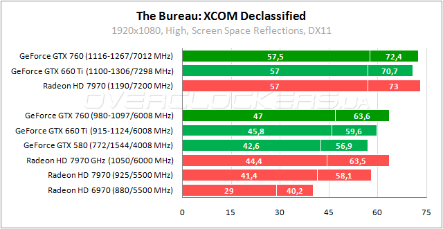 У GeForce GTX 760 средняя частота кадров на уровне простого Radeon HD 7970, а минимальная вполне сопоставима с GHz Edition. Весьма заметное отставание в 8–12% у GeForce GTX 660 Ti при стандартных частотах, которое снижается до 2–6% при разгоне. GeForce GTX 580 проигрывает 12–22%.
