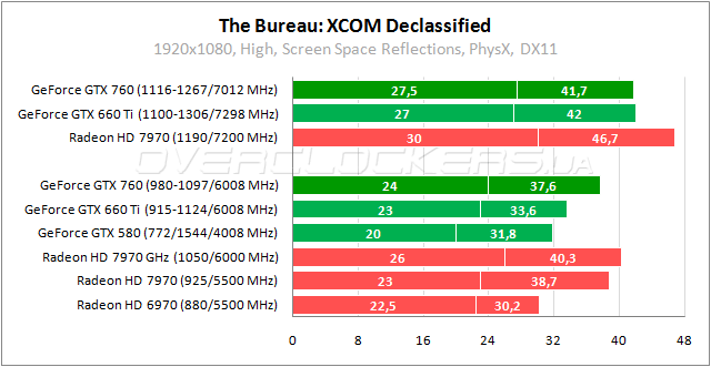 У GeForce GTX 760 минимальный отрыв от GeForce GTX 660 Ti в номинале, при разгоне эти участники меняются местами. Преимущество над GeForce GTX 580 тоже скромное. Без PhysX видеоадаптер проигрывает Radeon HD 7970, но при включении «физики» представители AMD резко сдают позиции и смещаются на последние строчки рейтинга.