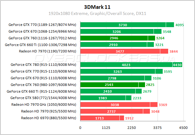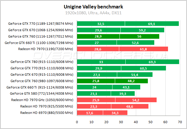 GeForce GTX 760 увеличивает отрыв от GeForce GTX 660 Ti до 9%, проигрывая Radeon HD 7970 уже 24%. Разгон позволяет занять среднюю позицию между GeForce GTX 670 и GeForce GTX 770.