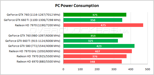 Самым экономичным решением является GeForce GTX 660 Ti. Этот видеоадаптер даже при разгоне демонстрирует аппетиты не выше показателей GeForce GTX 760 в номинале. Последний, кстати, не особо отличается от Radeon HD 6970. Самым прожорливым вышел GeForce GTX 580.