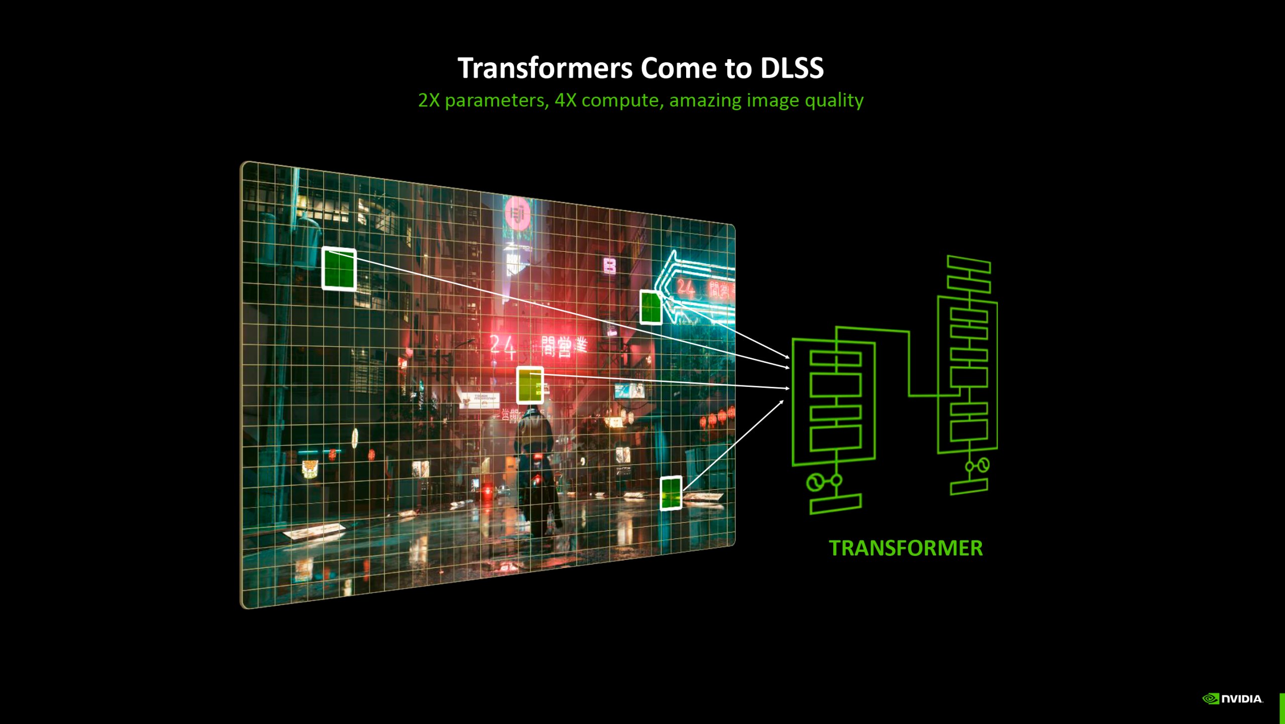 Важливим елементом підвищення продуктивності в новому поколінні GeForce RTX 50 стала поява DLSS 4 та Multi Frame Generation (MFG). NVIDIA перейшла від стандартної моделі побудови зображення CNN (Convolutional Neural Network) до моделі Transformer. Ця модель ШІ краще працює з динамічними даними, забезпечуючи якіснішу картинку при масштабуванні та усуваючи деякі невеликі артефакти, що мають місце при апскейлингу. Transformer вимагає більше ресурсів, але спеціально для цього в чипах Blackwell з’явилися потужніші тензорні ядра п’ятого покоління. Впровадження Transformer та зміни в оптичному конвеєрі дозволили реалізувати технологію Multi Frame Generation, яка генерує до трьох додаткових кадрів, підвищуючи плавність зображення і рівень комфорту.