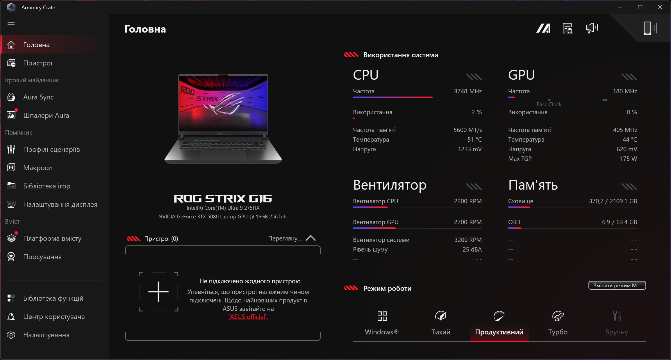Для моніторингу та управління ноутбуком на нього попередньо встановлено програмний командний центр Armoury Crate. Ця програма дозволяє спостерігати та контролювати всі робочі параметри — від температури компонентів до можливості тонкого налаштування підсвічування. Також Armoury Crate дає можливість швидко перемикатися між декількома робочими режимами з пріоритетом на продуктивність або тишу.