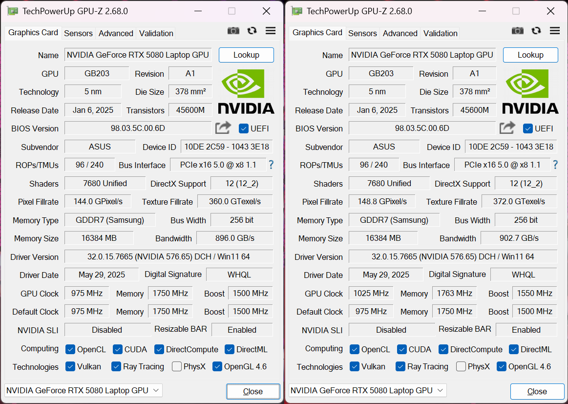 За замовчуванням ноутбук працює в «Продуктивному» режимі, який пропонує оптимальний баланс параметрів. У «Тихому» режимі енергоспоживання і частоти можуть бути не такими агресивними заради підтримки меншої швидкості вентиляторів, а в режимі «Турбо» система додатково прискорюється, включаючи невеликий розгін для відеокарти. Нижче наведено скриншоти GPU‑Z с характеристиками RTX 5080 для стандартного режиму і режиму «Турбо».