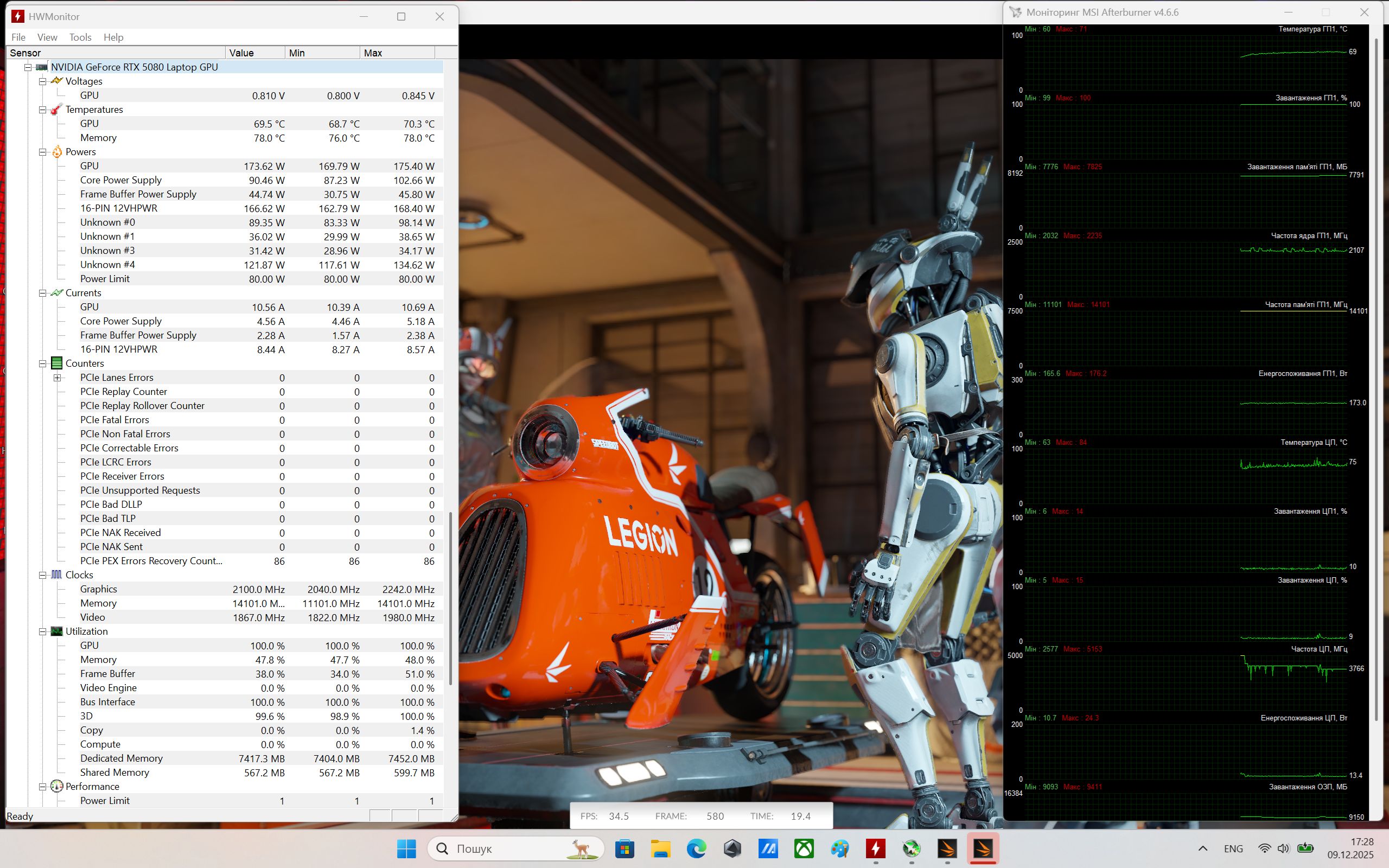 Що стосується максимального енергоспоживання відеокарти GeForce RTX 5080, то вона дійсно здатна працювати при 170–175 Вт з робочими частотами GPU в діапазоні 2100–2200 МГц.