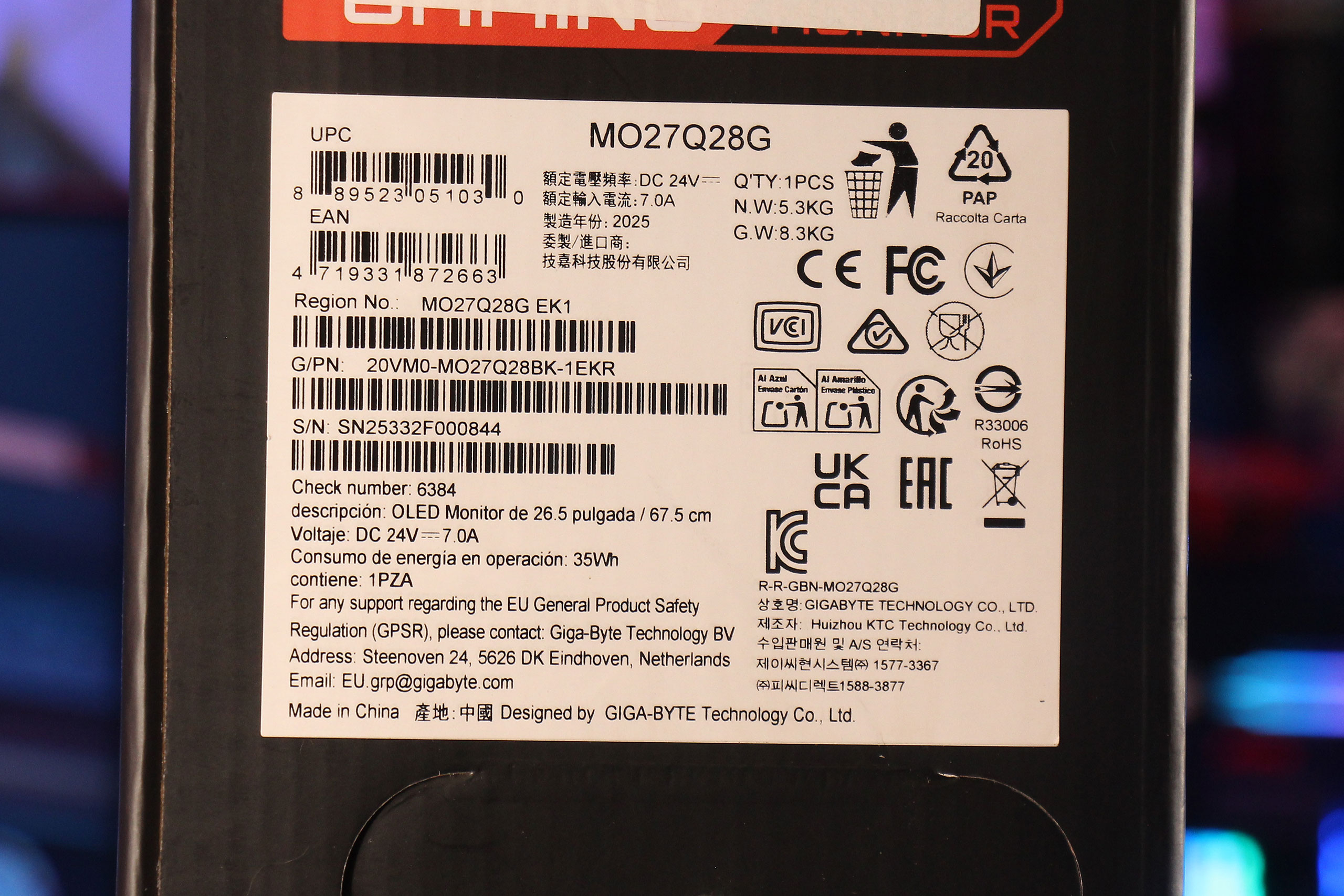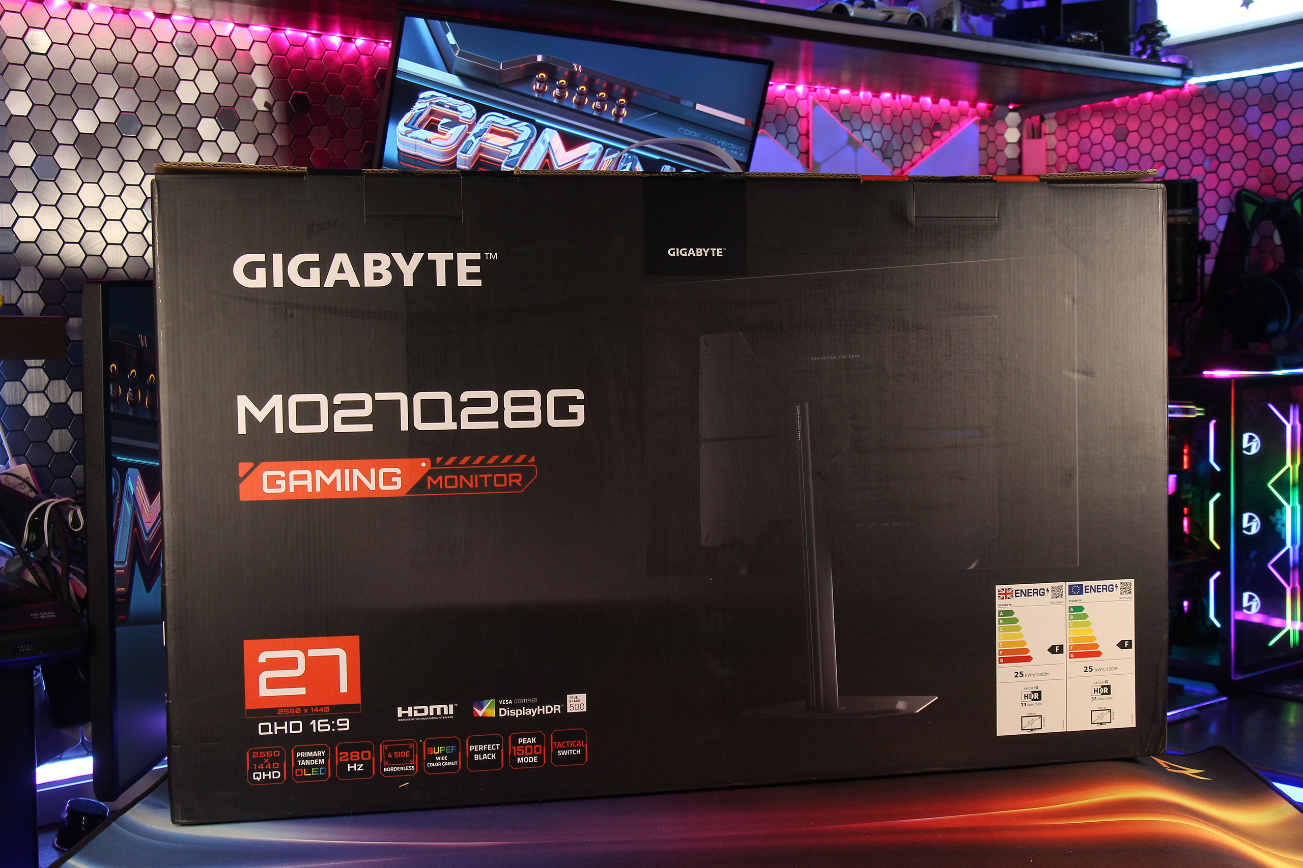 Gigabyte MO27Q28G постачається в темній коробці з повноколірною поліграфією. Упаковка має належний рівень захисту з використанням пінопластових вставок та захисної плівки на екрані. Рівень паковання відповідає очікуванням від монітора такого класу.