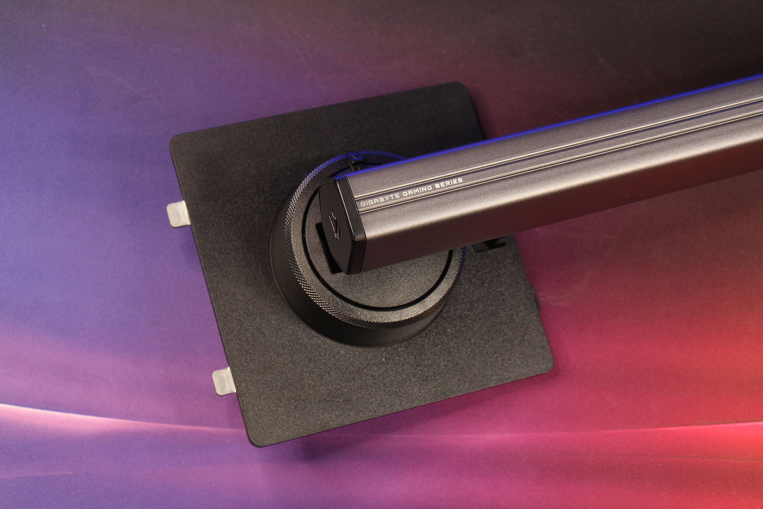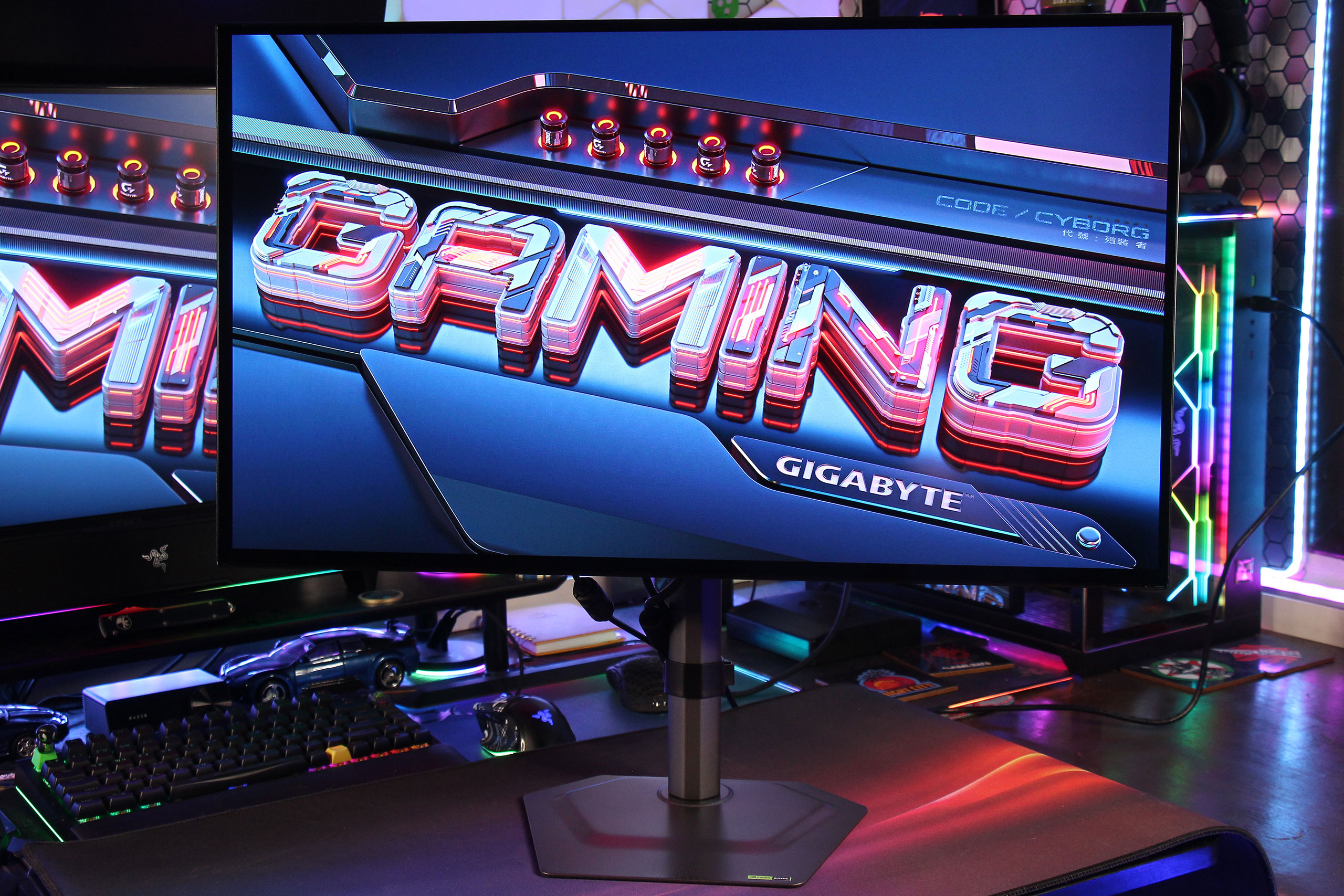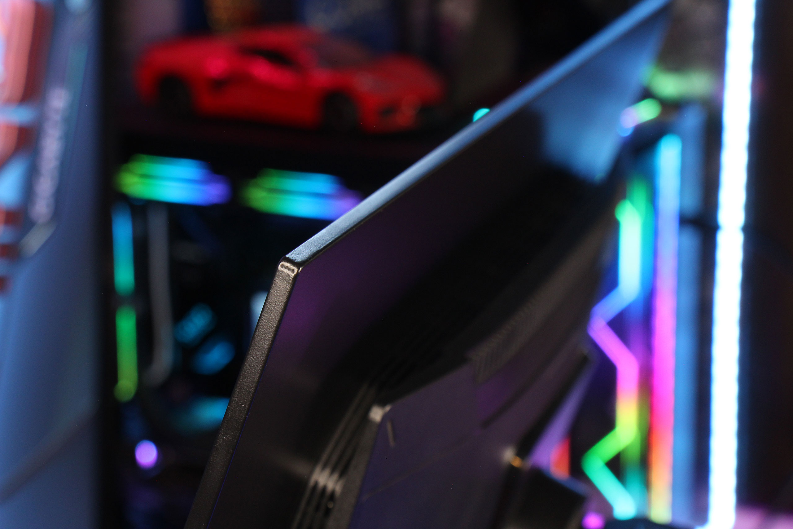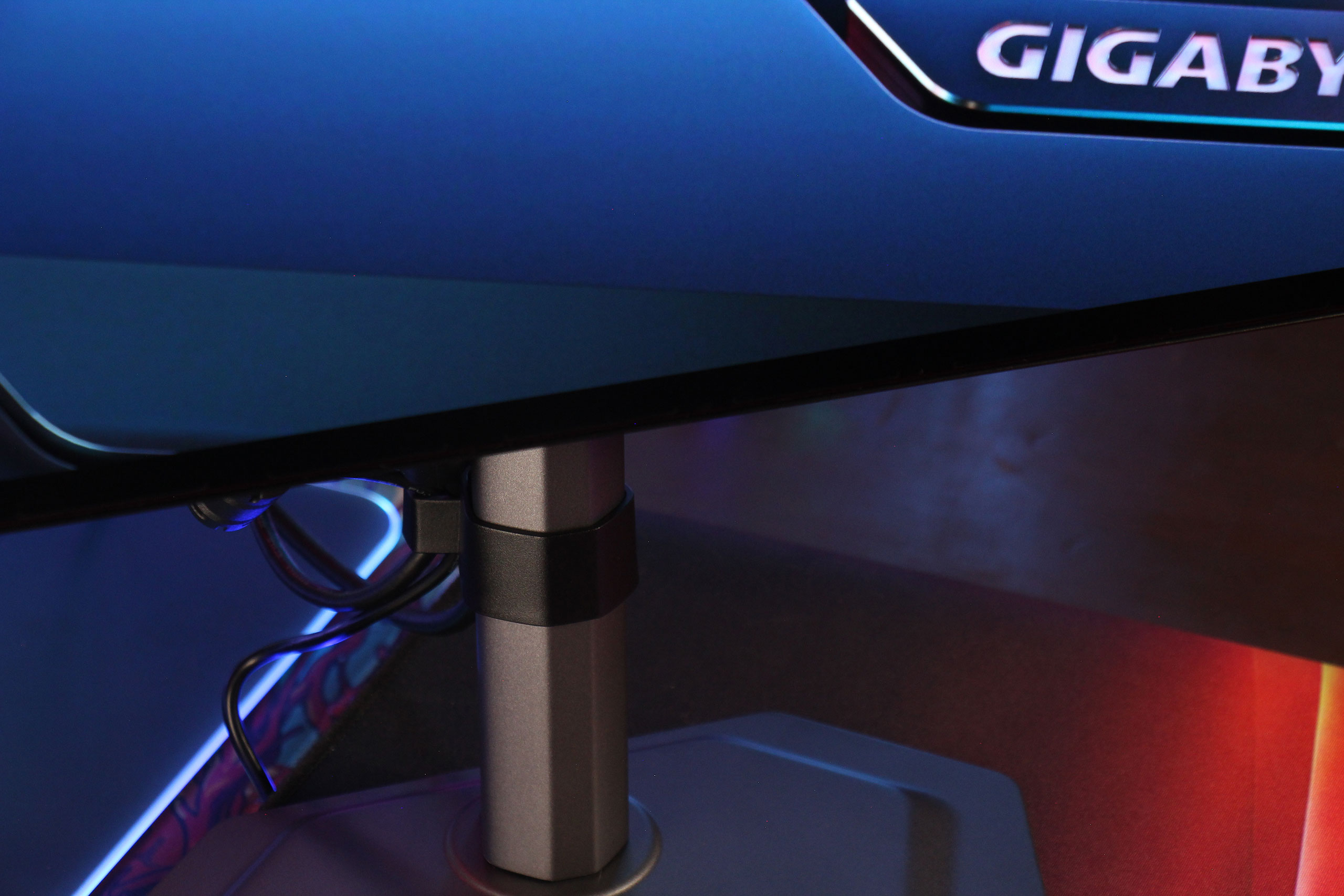Профіль монітора демонструє типову для OLED тонкість по краях, де товщина становить лише кілька міліметрів. Центральна частина дещо товща через розміщення електроніки та системи пасивного охолодження. Gigabyte використовує безвентиляторну конструкцію з масивним радіатором, що забезпечує абсолютно безшумну роботу.