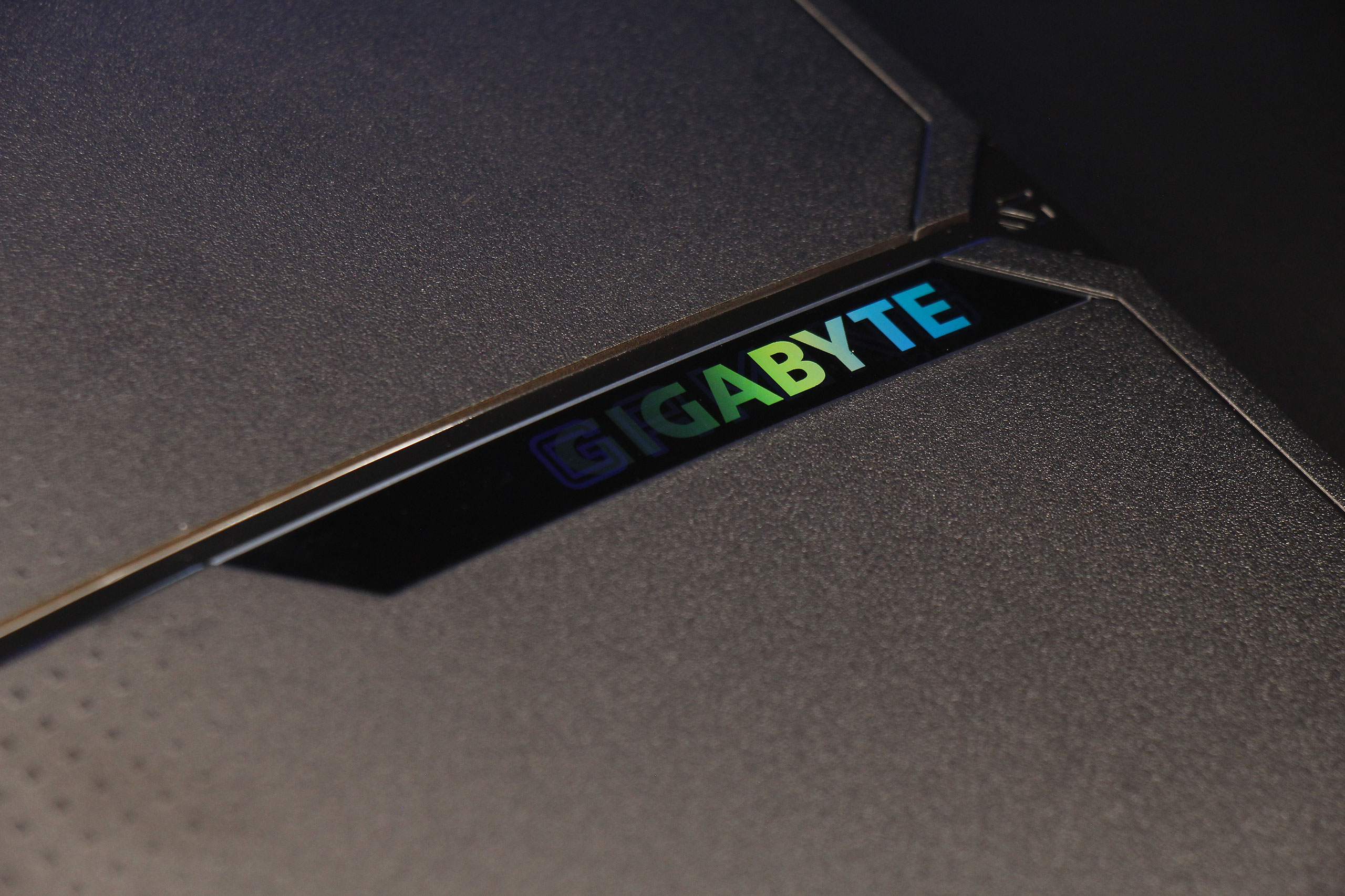 Задня панель оформлена без зайвих прикрас, окрім голографічної емблеми Gigabyte/Gaming праворуч. Вентиляційні отвори оптимізовані для ефективного пасивного відведення тепла. Відсутність активного охолодження є безумовним плюсом для тих, хто цінує тишу робочого місця.