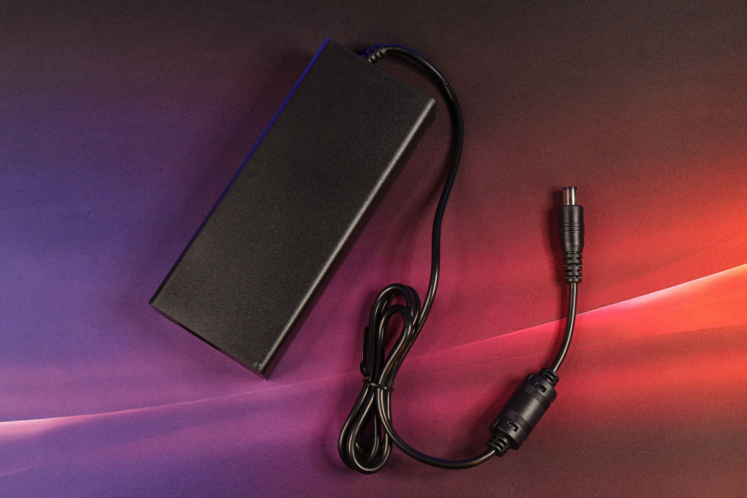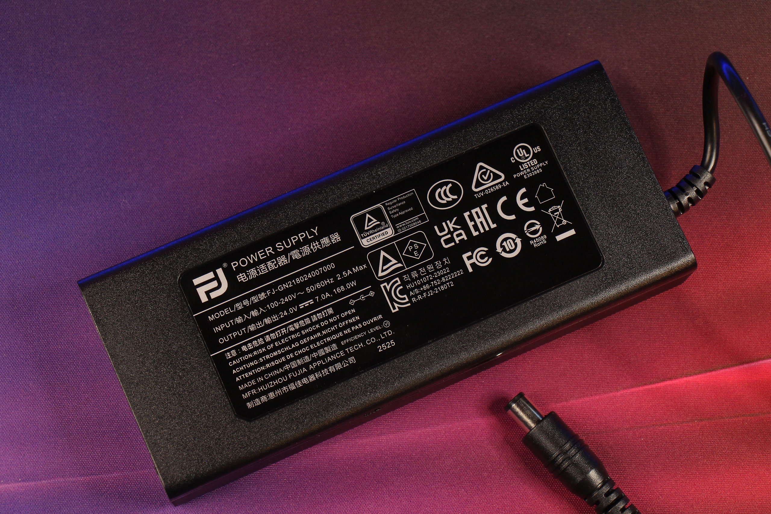 Всередині монітору не знайшлося місця для блоку живлення, тому використовується виносний, потужністю аж 168 Вт. Виробником є FJ (Huizhou Fujia Appliance Tech. Co., Ltd). На додачу до звичайного європейського кабелю живлення ще постачається британський.