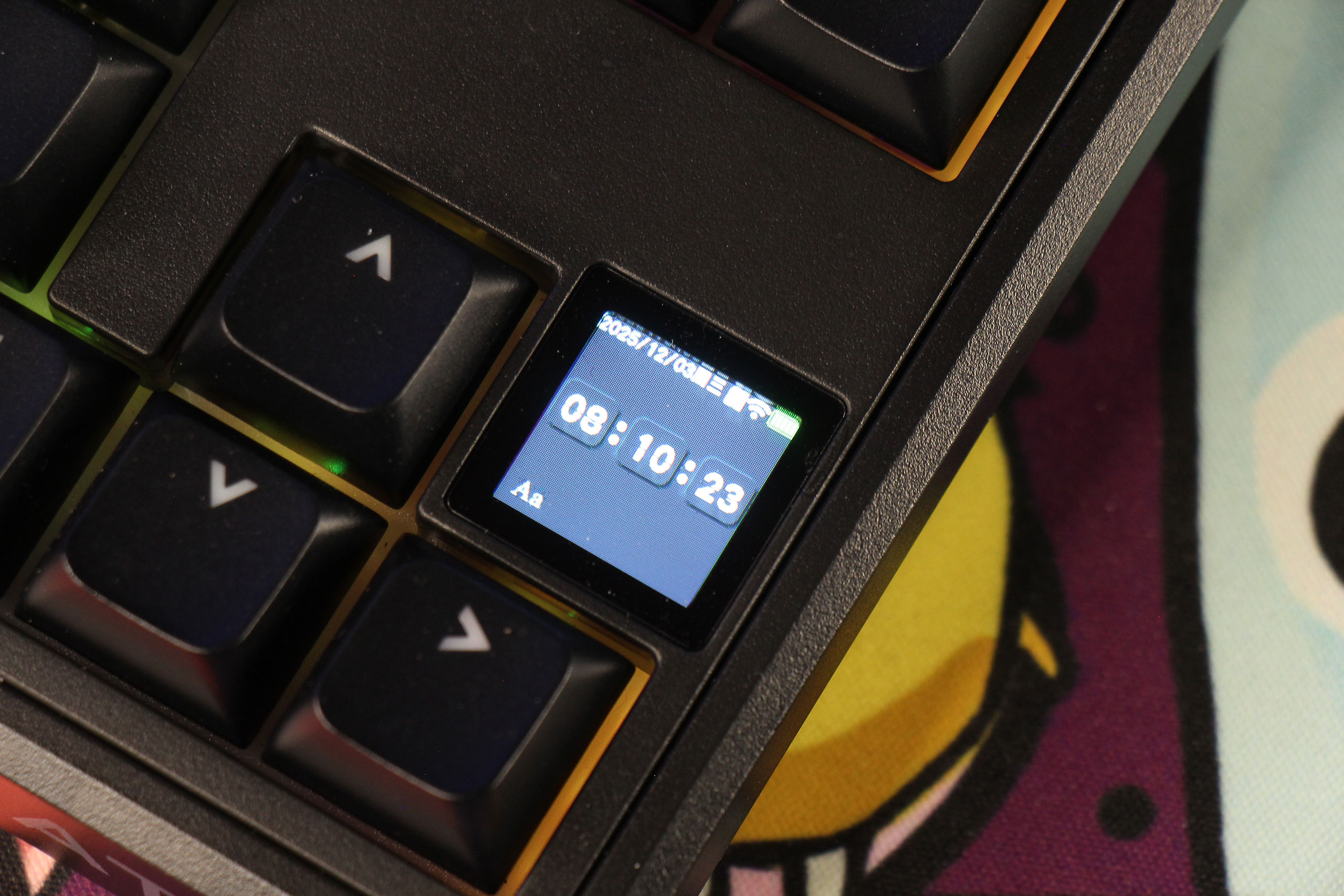 Головною візуальною відмінністю від звичайної Skyfall 80 Wireless є TFT-екран діагоналлю 0,85 дюйма, розташований у правому верхньому куті поруч з регулятором гучності. Екран дозволяє відображати поточні налаштування клавіш, корисну інформацію або власну анімацію. Це не лише декоративний елемент: на екрані можна бачити активний профіль, режим підключення, рівень заряду та інші параметри без необхідності відкривати програмне забезпечення.