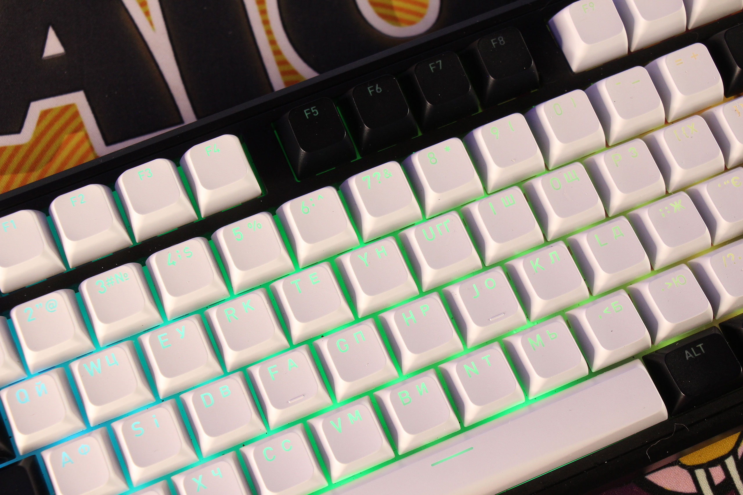 Одна з помітних змін порівняно зі звичайною Skyfall 80 Wireless полягає у матеріалі кейкапів. Замість ABS-пластику тут використовується PBT з подвійним литтям (double-shot). PBT має кращу стійкість до стирання та засалювання, а також приємнішу матову текстуру. Це логічне рішення для клавіатури преміумкласу. Профіль залишився фірмовим OMA, унікальним для HATOR.
