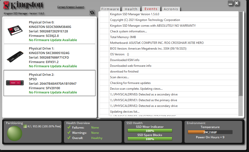 Опціонально виробник пропонує користувачу завантажити утиліту Kingston SSD Manager, в якій можна перевірити наявність нової прошивки для накопичувача, його знос, температуру, переглянути SMART, а також логічні розділи на диску.
