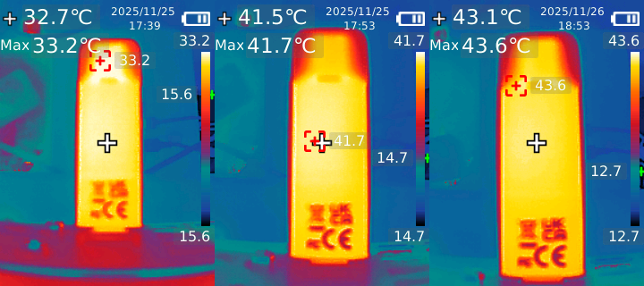 Тепловою камерою було зафіксовано максимальну температуру корпусу в 33 градуси під час спокою, 42 градуси після закінчення копіювання тестового архіву, а також 44 градуси після стрес-навантаження. Тобто під час тестування корпус не був настільки гарячим. Та і теплового тротлінгу під час тестування не було зафіксовано, тож не слід перейматись цим питанням.