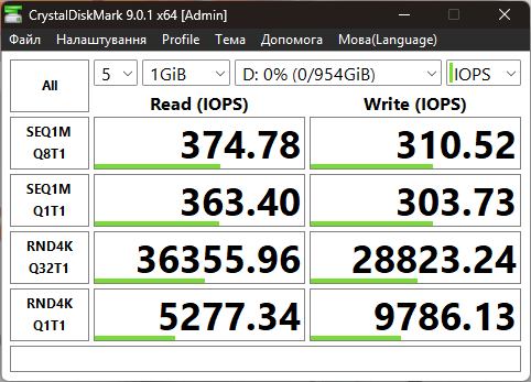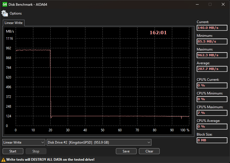 Загалом максимальна швидкість лінійного запису склала 962,3 МБ/с, середня 287,7 МБ/с, а мінімальна 85,5 МБ/с. Після перетину тих самих 20% місткості запис відбувався при швидкості приблизно 135—145 МБ/с, про що слід пам’ятати, якщо від цього накопичувача буде очікуватись інтенсивна експлуатація. А якщо ні — заявлені швидкості не стануть проблемою.