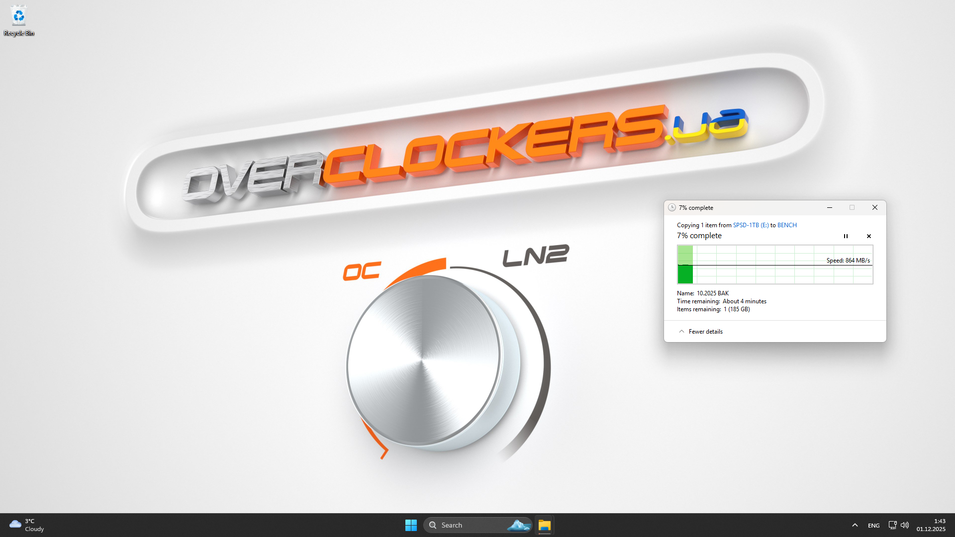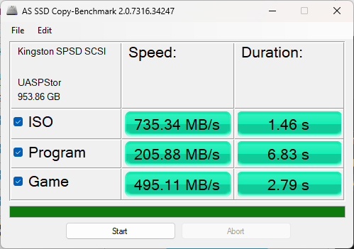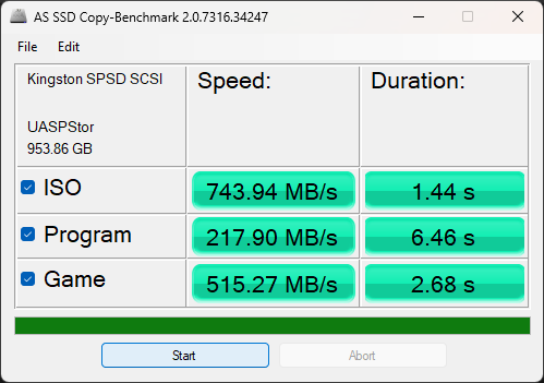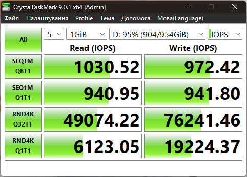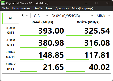 Традиційно розпочнемо з того, чим цей накопичувач буде займатись все своє життя — стандартна робота з файлами. В рамках ОС Windows 11 тестовий архів записувався на накопичувач на швидкості близько 755 МБ/с. У зворотний бік це відбувалось на швидкості близько 864 МБ/с.
