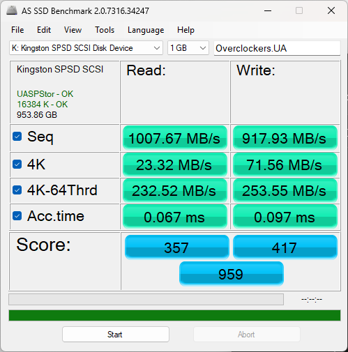 Останнє про що слід поговорити перед класичним тестуванням — це енергоспоживання. Накопичувач працює від напруги 5 В і під час спокою він споживає лише 0,5 Вт, в повноцінному навантаженні це буде вже 1,3 Вт. Якщо ж використовуються повільніші інтерфейси, то це буде взагалі 0,45 Вт в режимі навантаження. Тож можна сміливо заявити, що накопичувач такий же економічний, як і типова «флешка».