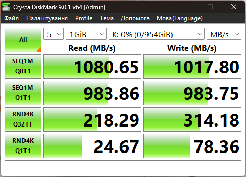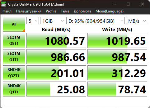 Нагадуємо, що всі наступні бенчмарки подаються у вигляді трьох блоків результатів: перший на порожньому накопичувачі, другий на заповненому на 95% місткості накопичувачі, а третій — в режимі роботи в рамках USB 3.2 Gen 1.