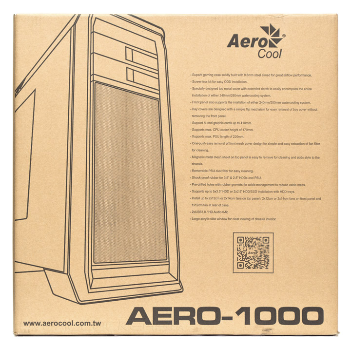 Коробка остается коробкой, как ее не назови, и в этом плане у Aerocool Aero-1000 все абсолютно стандартно. Схематическое изображение внешности корпуса нанесено на упаковку спереди и сзади. Его достоинства и некоторые технические характеристики расписаны рядом, и, в более мелком виде, зато на десяти языках (включая русский) — на боковине коробки. Ручек для переноски нет, несмотря на то, что продукт довольно увесистый. Защита от повреждений — привычные пенопластовые демпферы внутри, пластиковый кулек и наклейки на глянцевой поверхности и боковом окне.