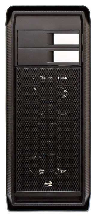 Внешний вид Aerocool Aero-1000 типичный для всей данной серии и я бы назвал его сдержанным. Цвет окраски черный, хотя в продаже можно встретить и белый вариант. Большую часть передней панели занимает металлическая вентиляционная решетка. Над ней есть две легкосъемные заглушки 5,25″ отсеков. Серые пластинки на них — это защелки, которые при откидывании влево открывают замок на заглушке. Больше ничего примечательного тут нет.