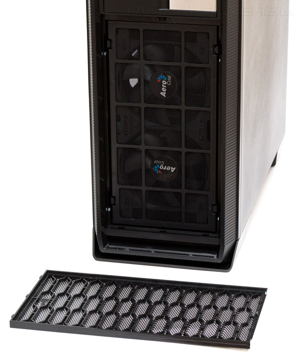Фильтр держится на своем месте благодаря магнитным лентам, приклеенным по периметру рамки. Очень легко снимается и очищается. За фильтром видим крупноячеистую сотовую решетку с посадочными местами под два 120- или 140-мм вентилятора.