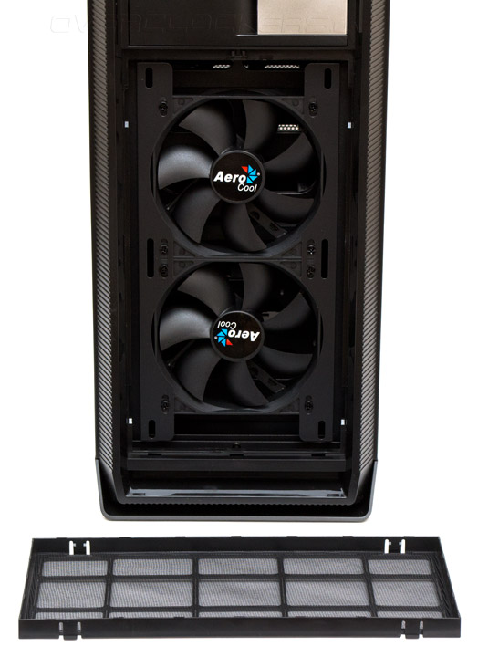Чтобы извлечь обойму с фильтром, нужно будет нажать на защелки по его бокам. За фильтром скрывается посадочное место для двух 120- или 140-мм вентиляторов. Причем на вдув, по умолчанию, предустановлены оба 120-мм пропеллера.