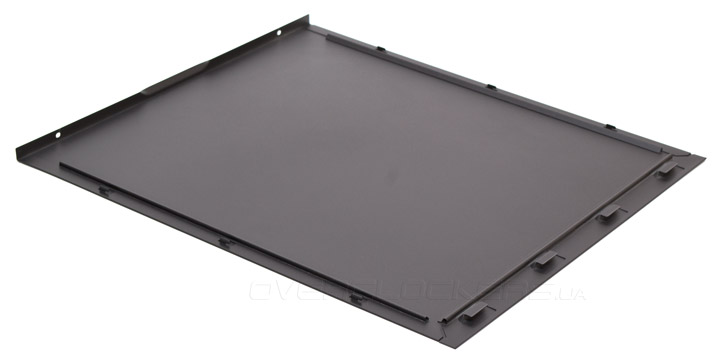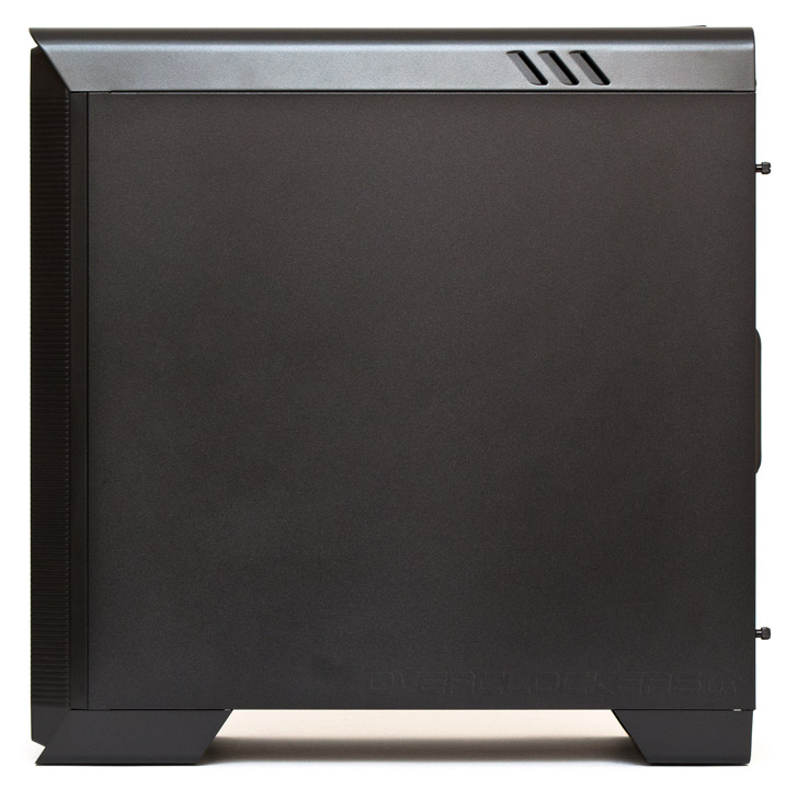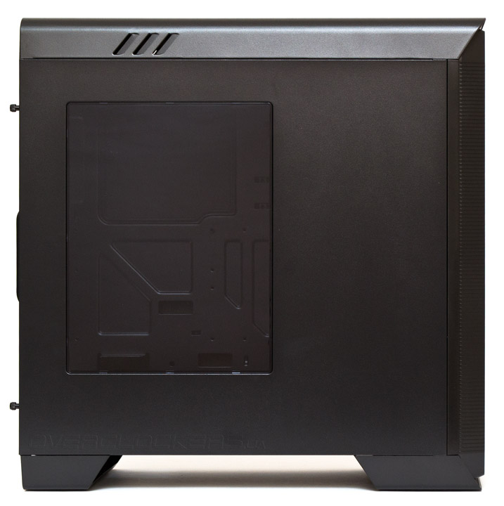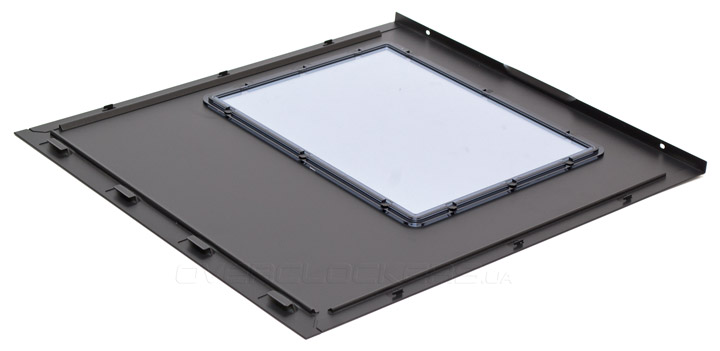 Левая боковая панель ровная, в ее задней части заподлицо встроено дымчатое акриловое окно размером 285х215 мм. На металлической кромке верхней панели есть три диагональные прорези, выполняющие скорее декоративную, чем функциональную роль. Панель снабжена штампованной ручкой и удерживается на месте двумя винтами с накатанной головкой. Снимается по направлению назад.