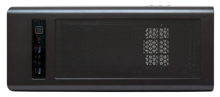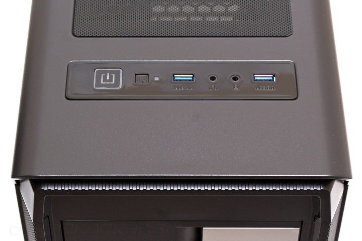 Крупная квадратная кнопка включения снабжена синей подсветкой, по ободу и в центре. Рядом с ней располагается маленькая клавиша перезагрузки системы, слева от которой есть еще меньший квадратный красный индикатор активности накопителей. Два порта USB 3.0 отстоят максимально далеко друг от друга, чтобы не мешать подключению внешних устройств. Между ними находится два 3,5-мм аудиовхода для наушников и микрофона. Все порты расположены вертикально и чтобы избежать накопления в них пыли, в комплекте предусмотрены резиновые заглушки соответствующего размера.